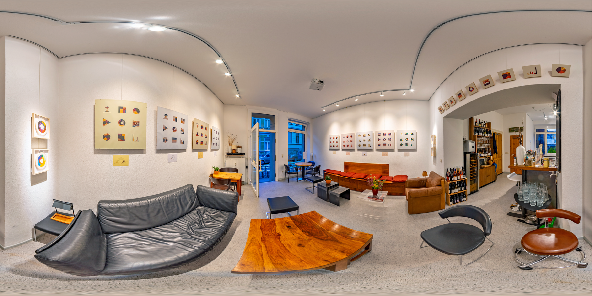 The 360-degree images in Little Planet-Format impressively show the exhibition in the restaurant just in time for the blue hour in a beautiful color contrast of yellow interior light and blue exterior light Blue Hour in the heart of Bonn's old town.